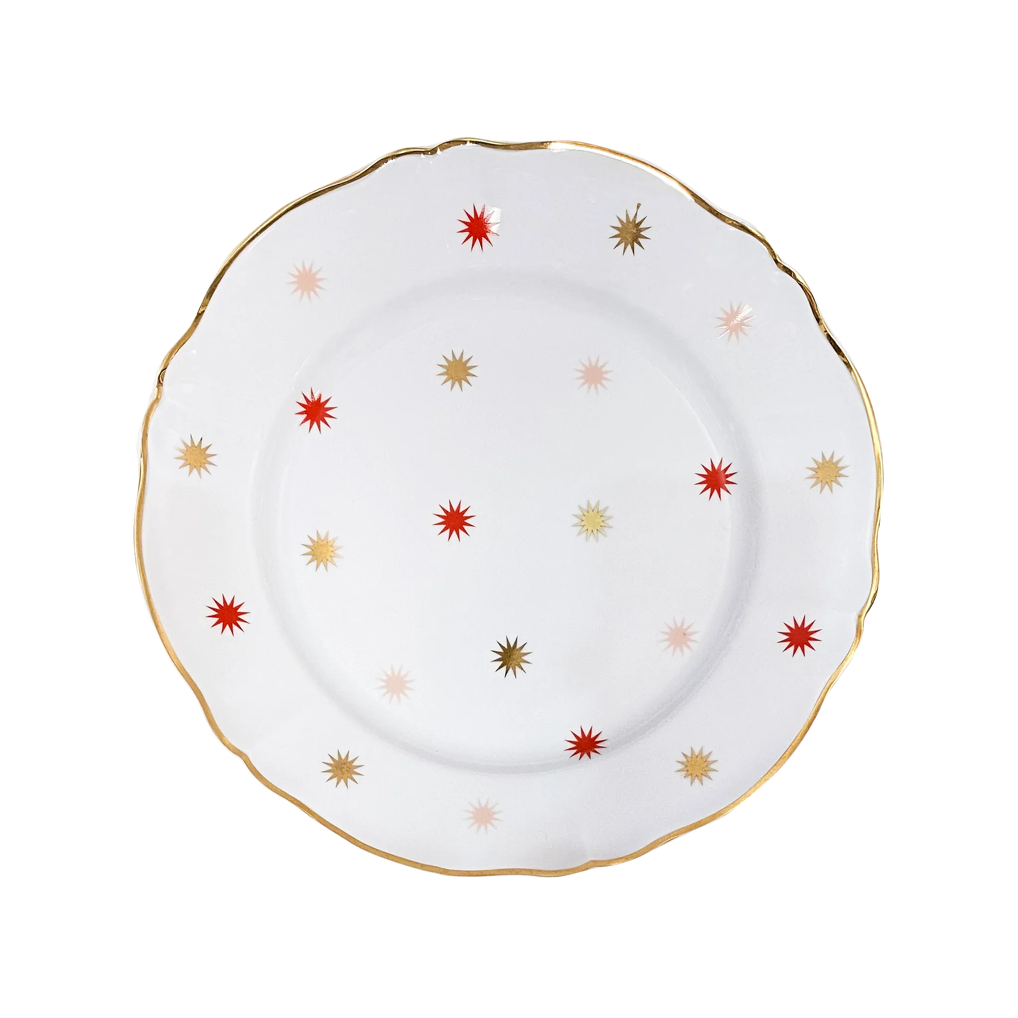 Prato fundo unitário, para sopa ou massa, de porcelana italiana Bitossi branca, com decoração vermelha e dourada inspirada nos anos 80, pintada à mão, e borda com filete de ouro 22k.
