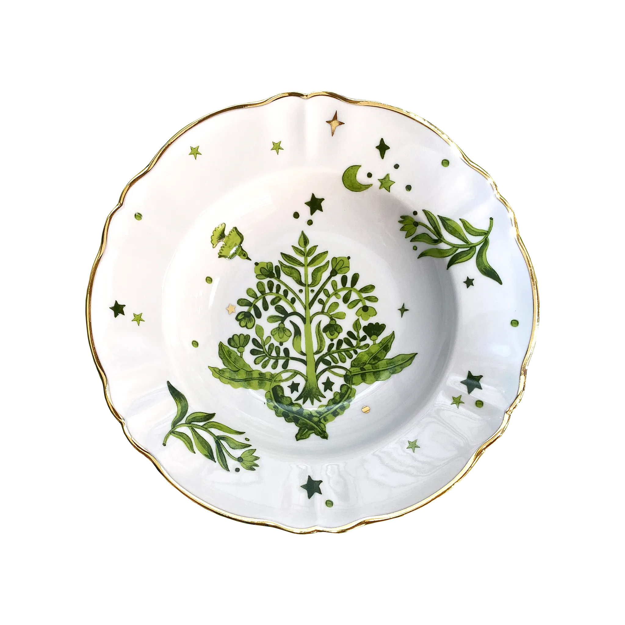 Prato fundo unitário, de porcelana italiana Bitossi branca, com decoração floral verde, pintada à mão, e borda com filete de ouro 22k.