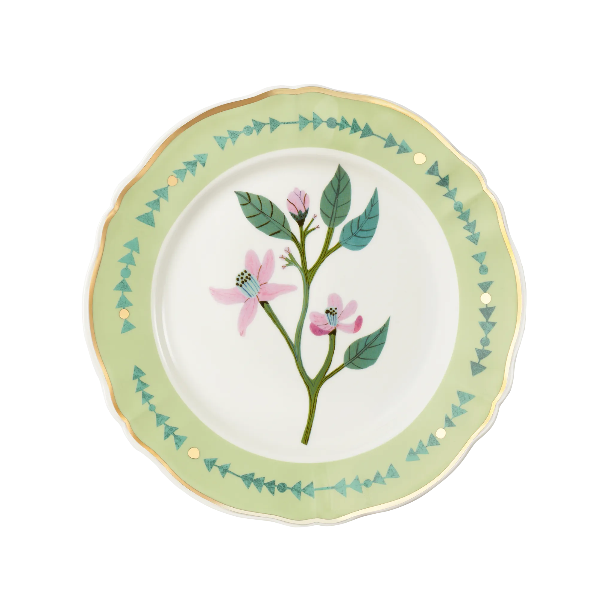 Prato raso unitário, de porcelana italiana Bitossi branco e verde, com decoração colorida floral, pintada à mão, e borda com filete.