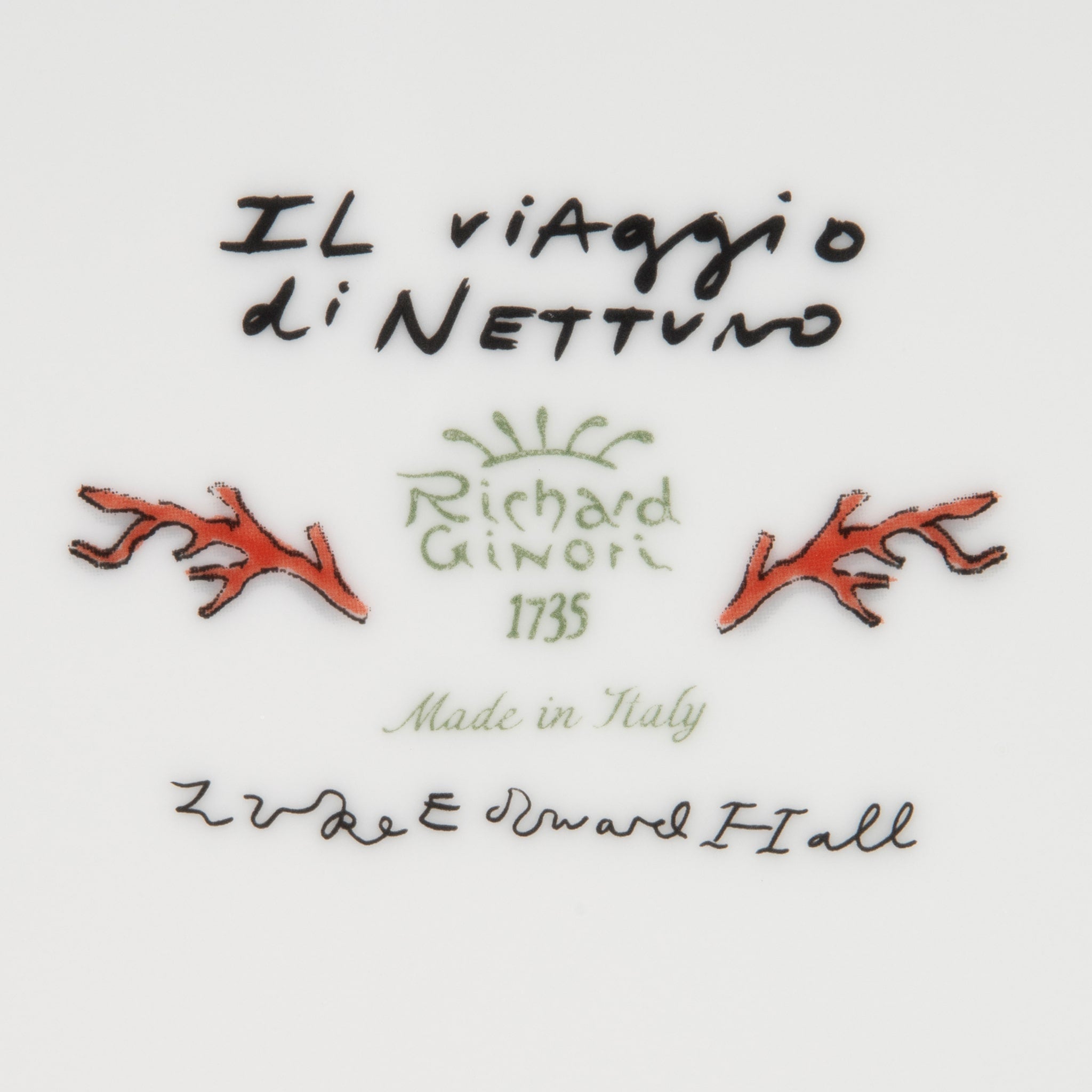 Prato de pão da coleção Il Viaggio di Nettuno pela Richard Ginori, em porcelana italiana laranja, com decoração marinha pintada à mão, com friso dourado.