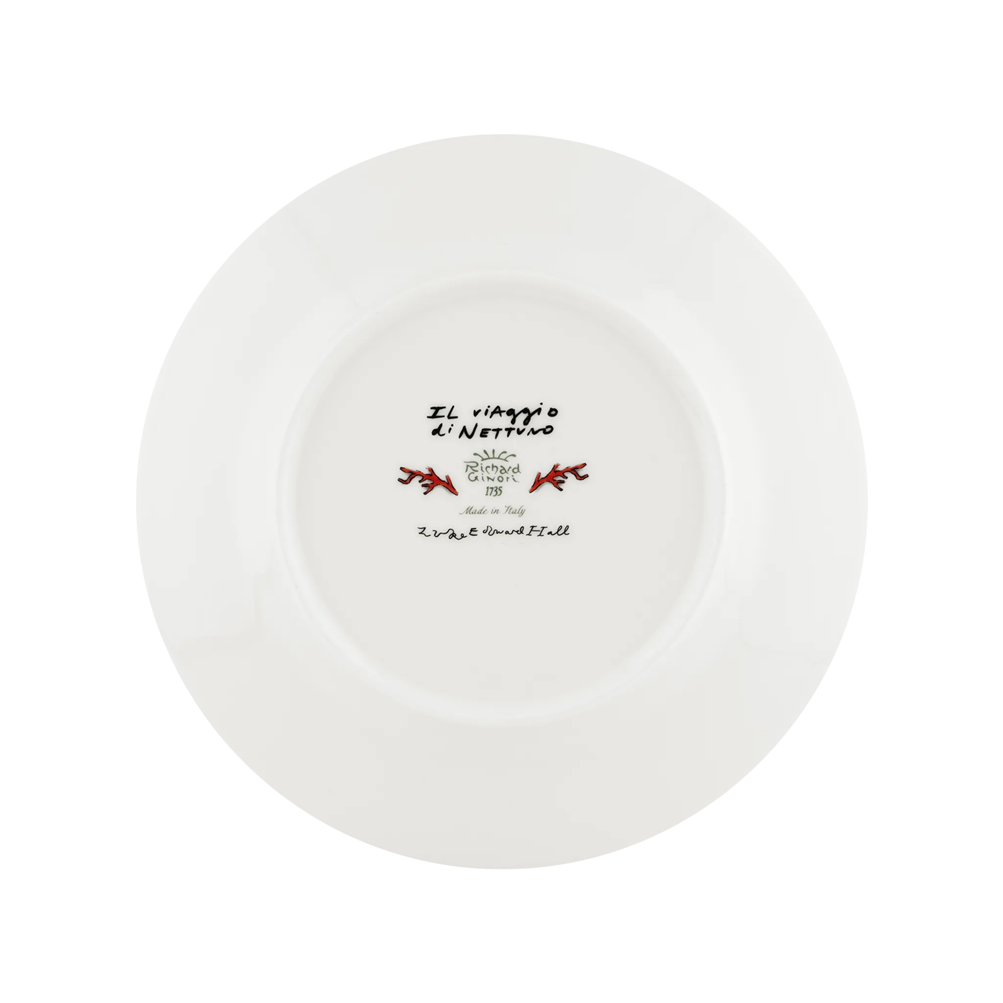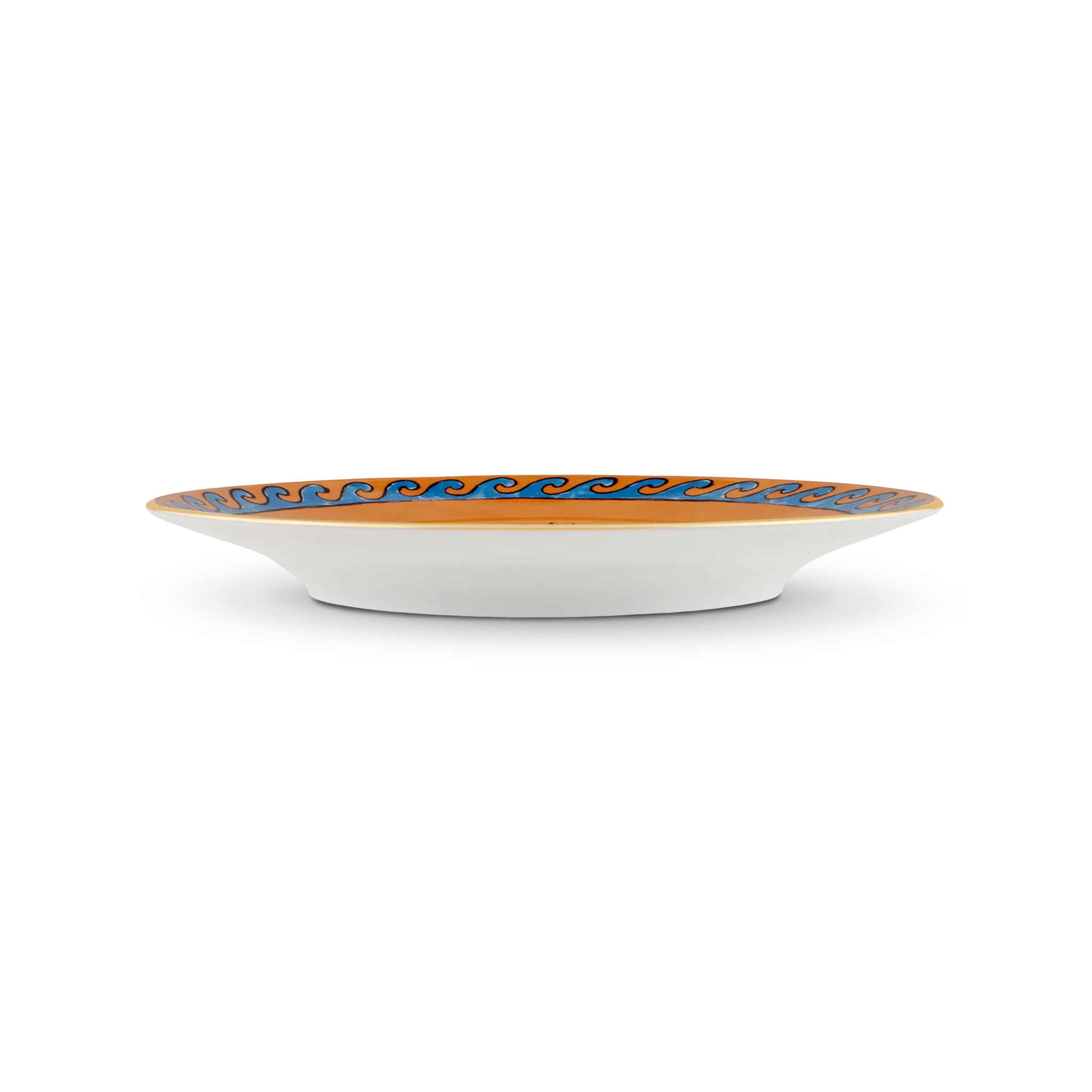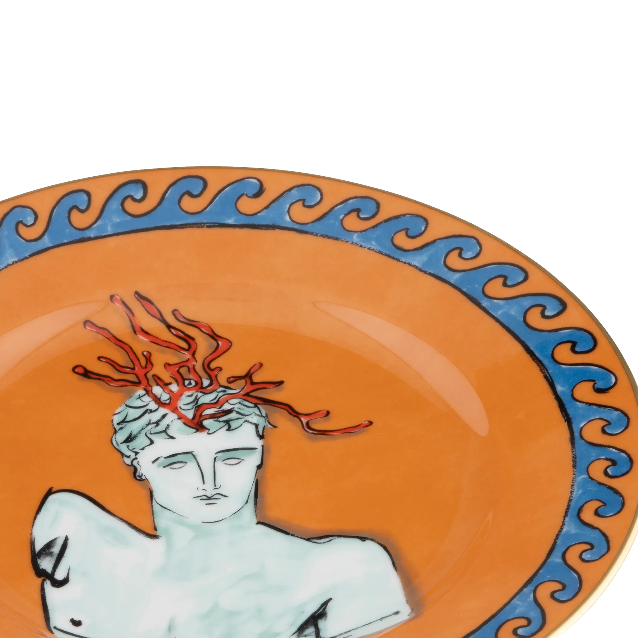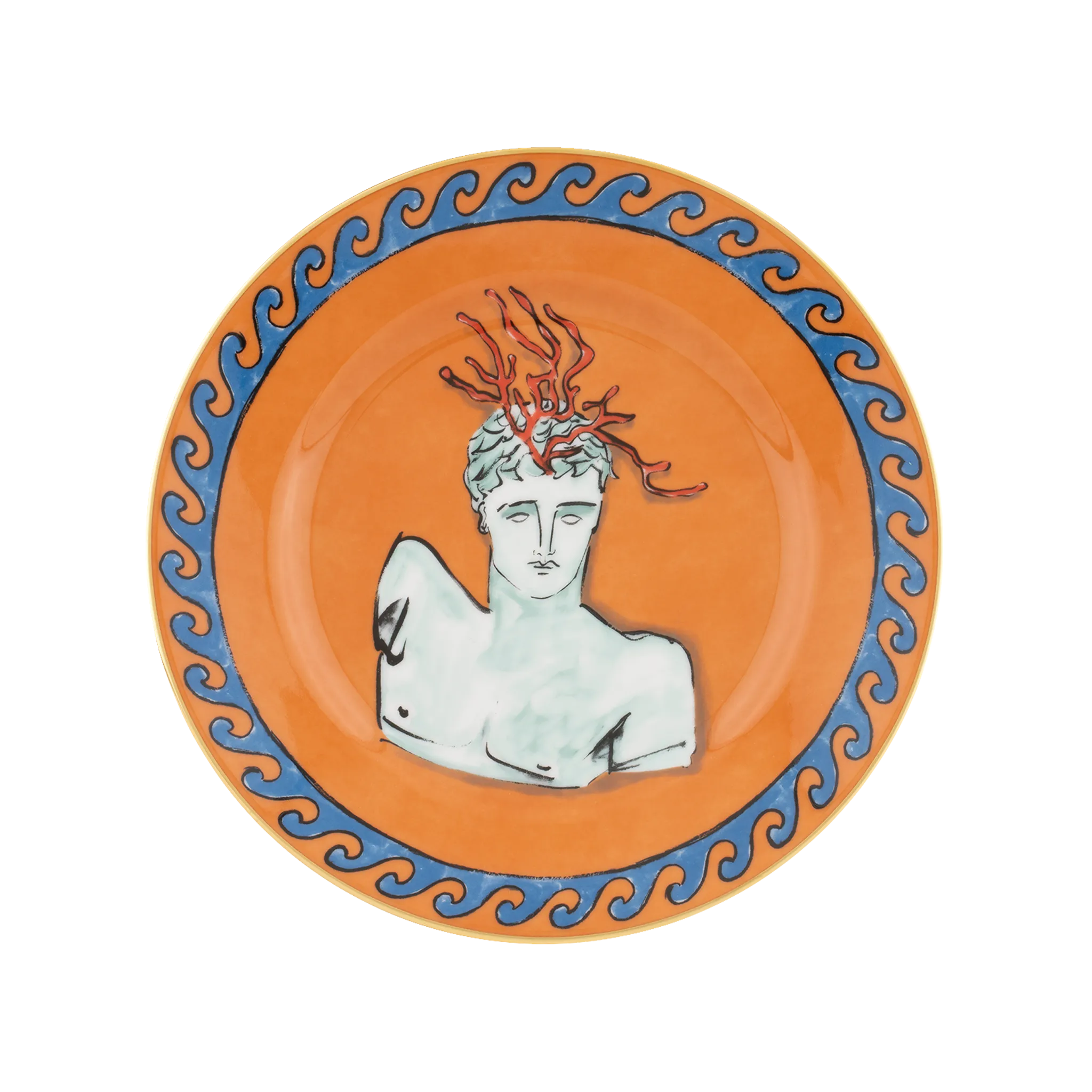 prato de sobremesa, da coleção Il Viaggio di Nettuno pela Richard Ginori, em porcelana italiana laranja, com decoração marinha do Deus Netuno pintada à mão.