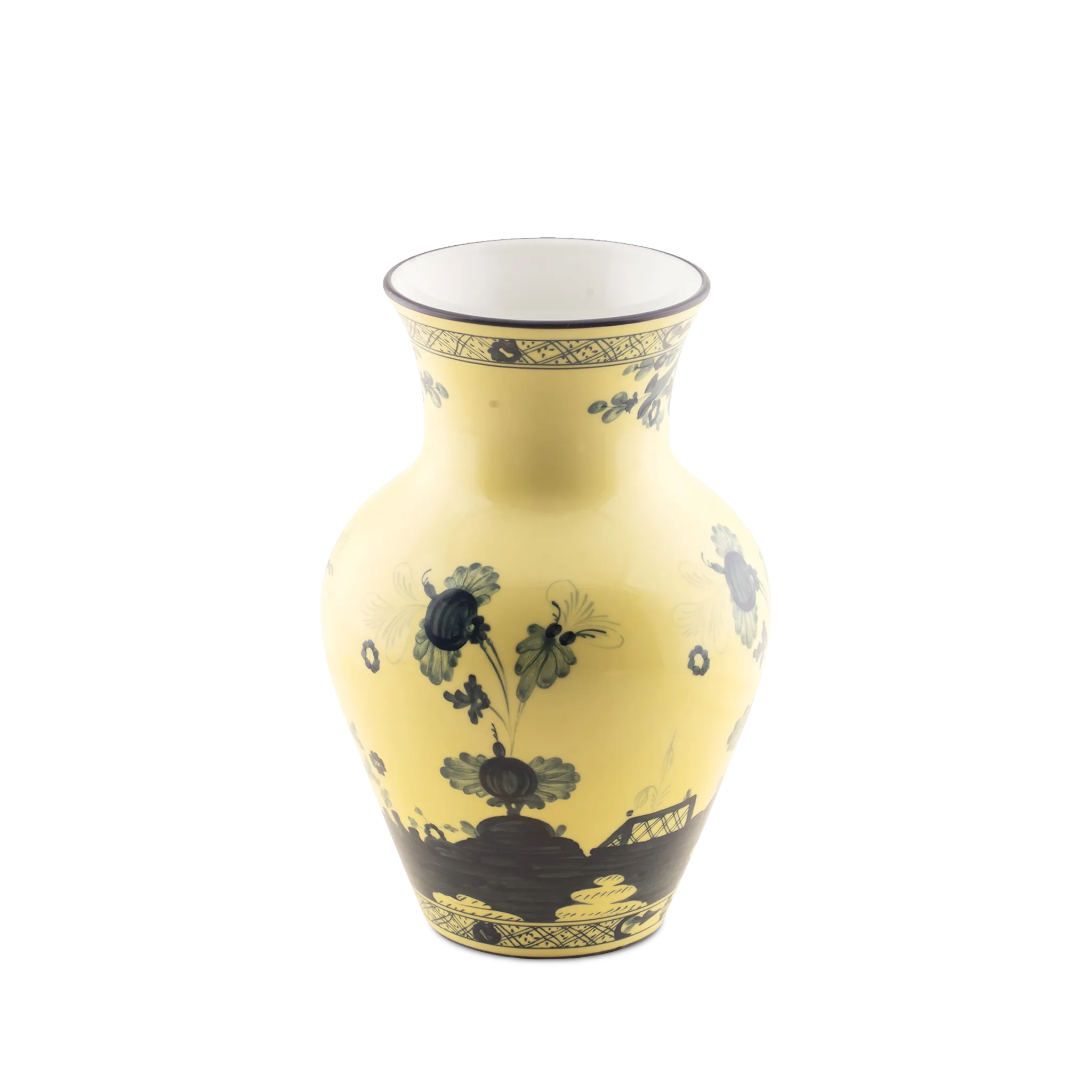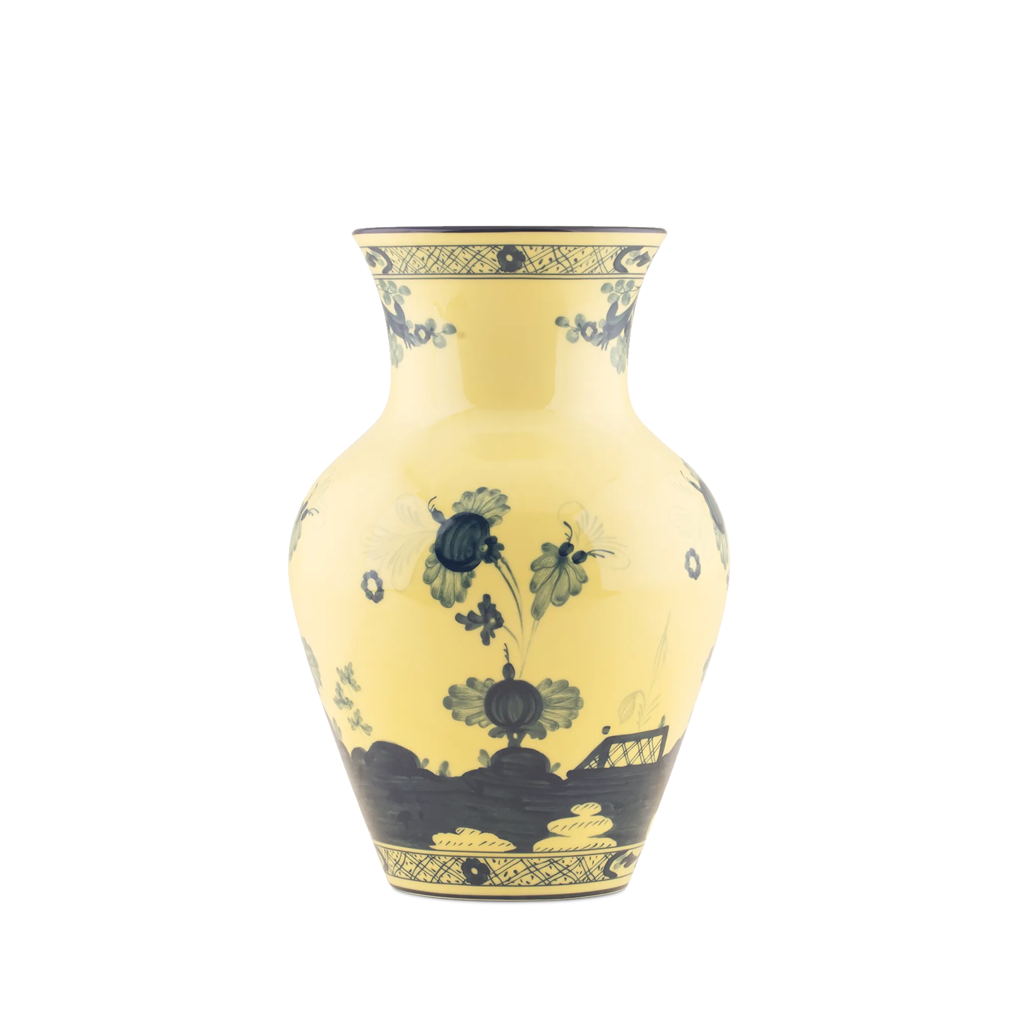 Vaso em formato clássico e tradicional bojudo, em tamanho médio, em porcelana italiana da tradicional marca fiorentina Manifattura Richard Ginori. Pintado à mão em trabalho artesão manual, com decoração Oriente Italiano da Coleção Antico Doccia, coleção criada em 1735 e presente nas casas reais mais importantes resentes da marca.