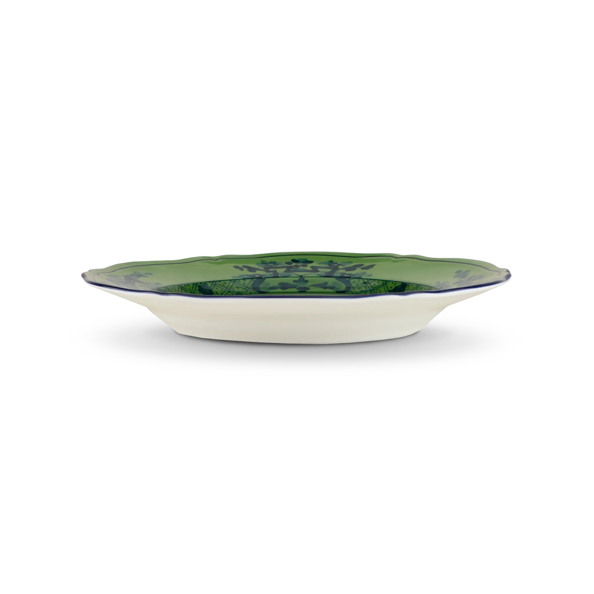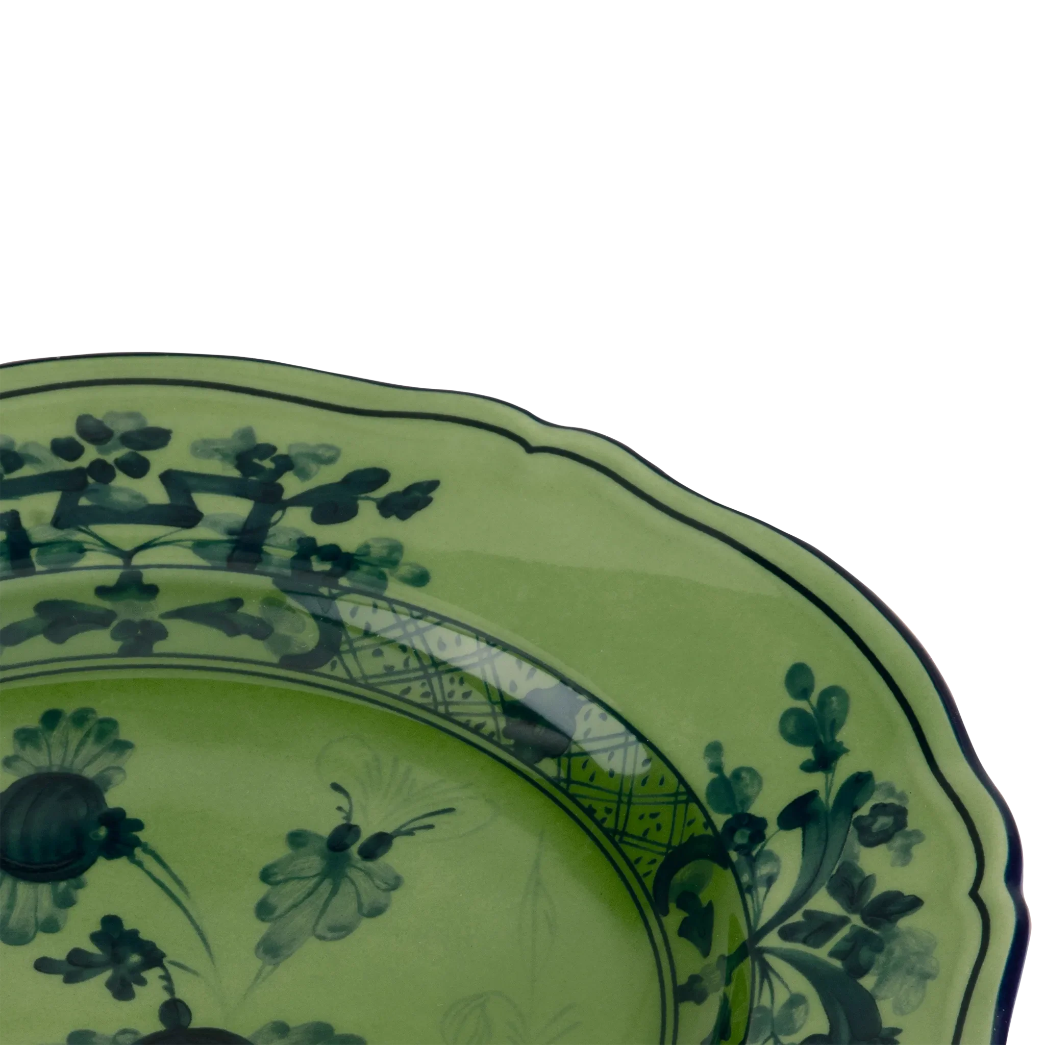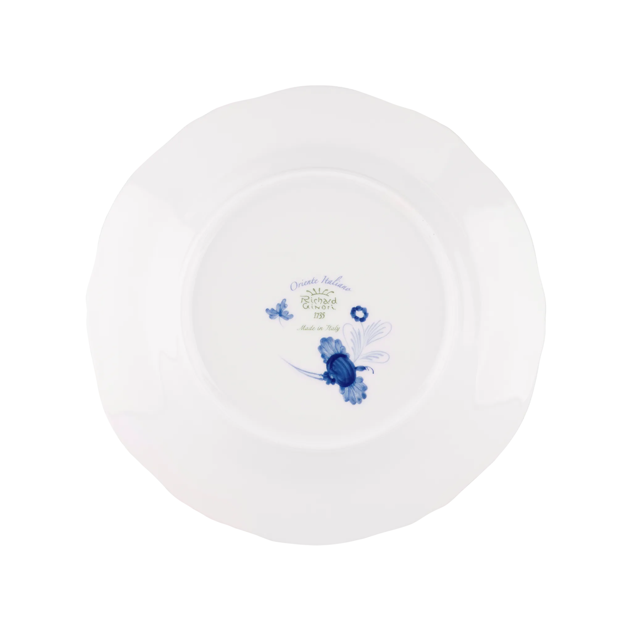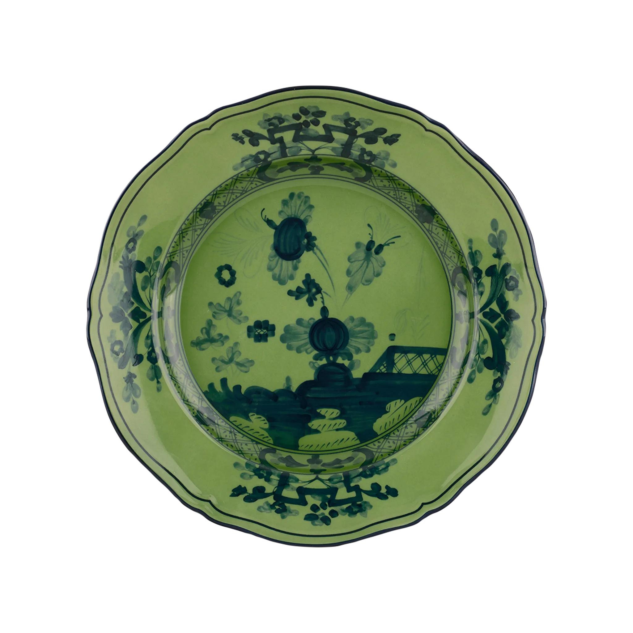 Prato sobremesa de porcelana italiana da tradicional marca fiorentina Manifattura Richard Ginori, pintados à mão em trabalho artesão manual, com decoração Oriente Italiano da Coleção Antico Doccia, criada em 1735 e presente nas casas reais mais importantes - Malachite, em colorido azul fechado pintado em pinceladas suaves sobre verde malaquite.