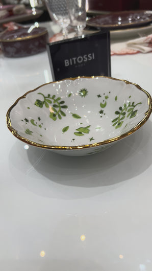 Bowl unitário de porcelana italiana Bitossi branca, com decoração floral verde, pintada à mão, e borda com filete de ouro 22k.