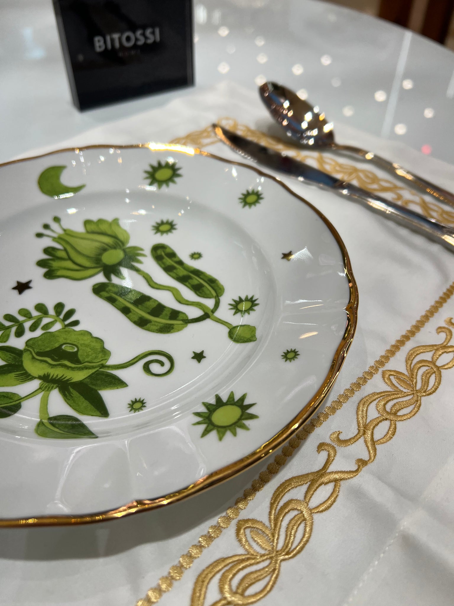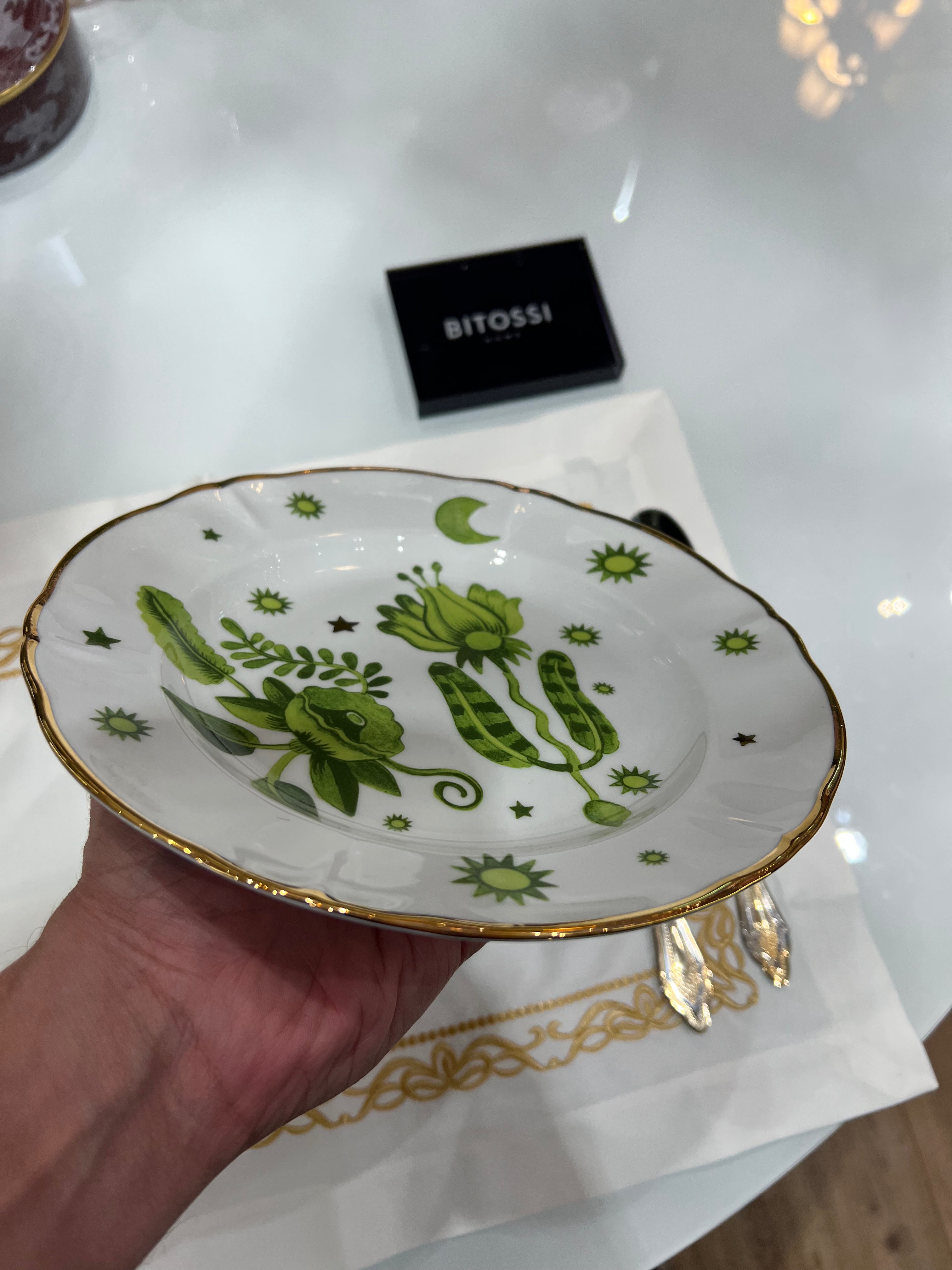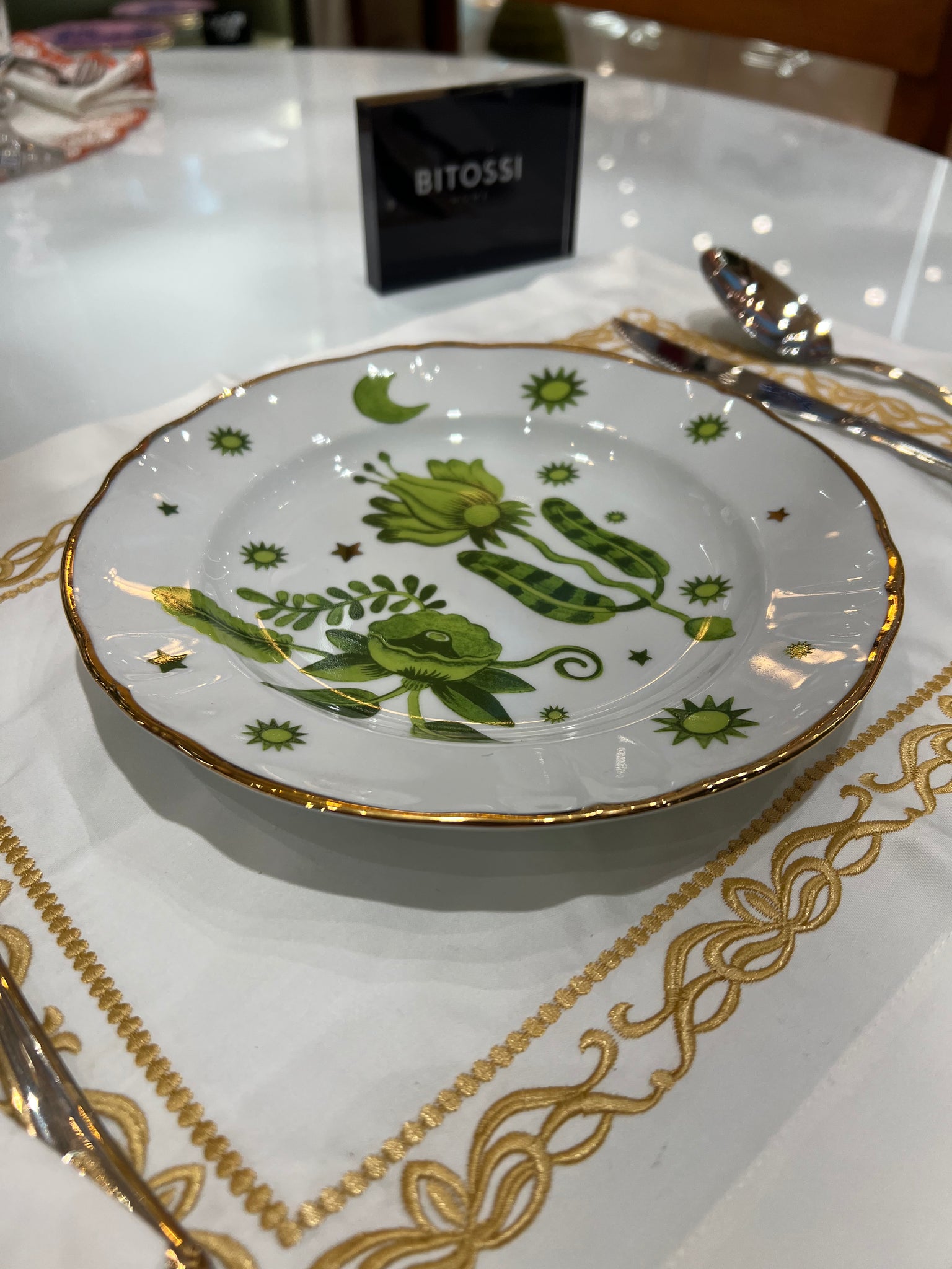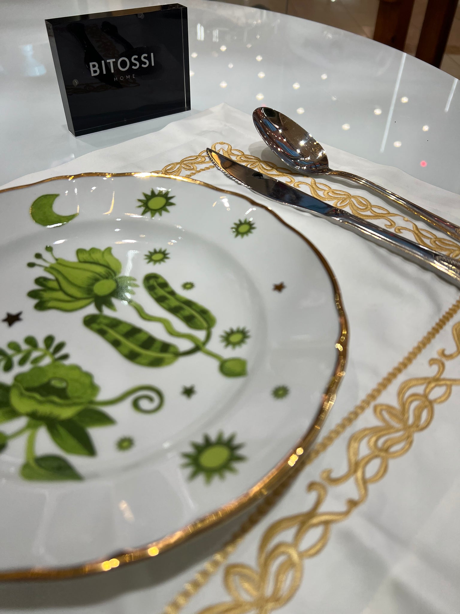 Prato sobremesa unitário, de porcelana italiana Bitossi branca, com decoração floral verde, pintada à mão, e borda com filete de ouro 22k.
