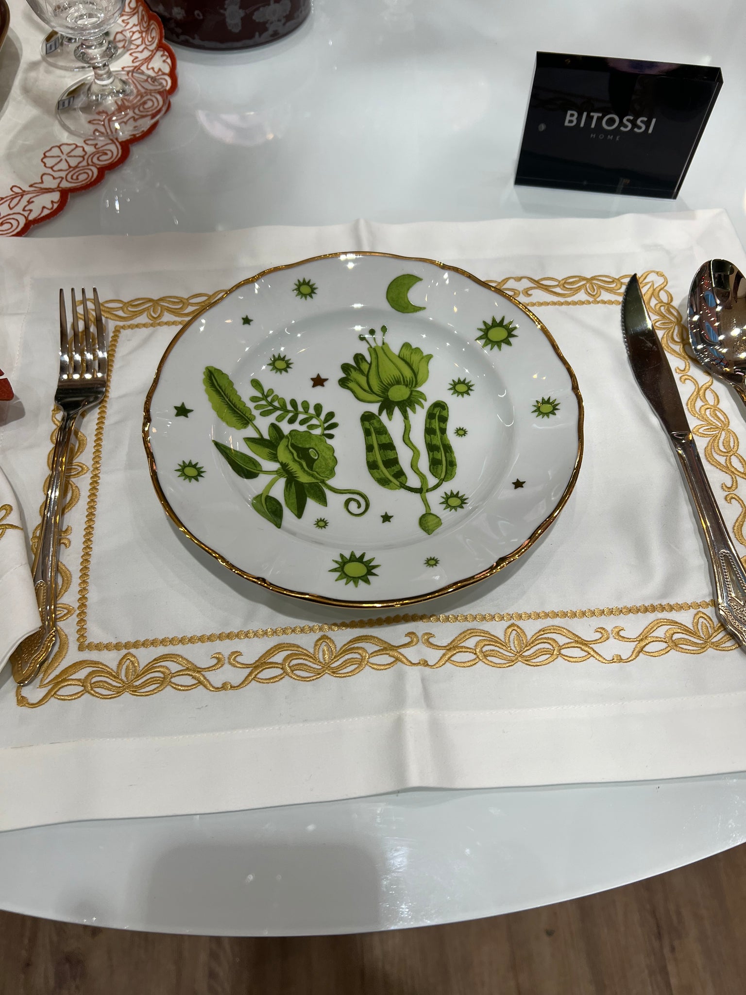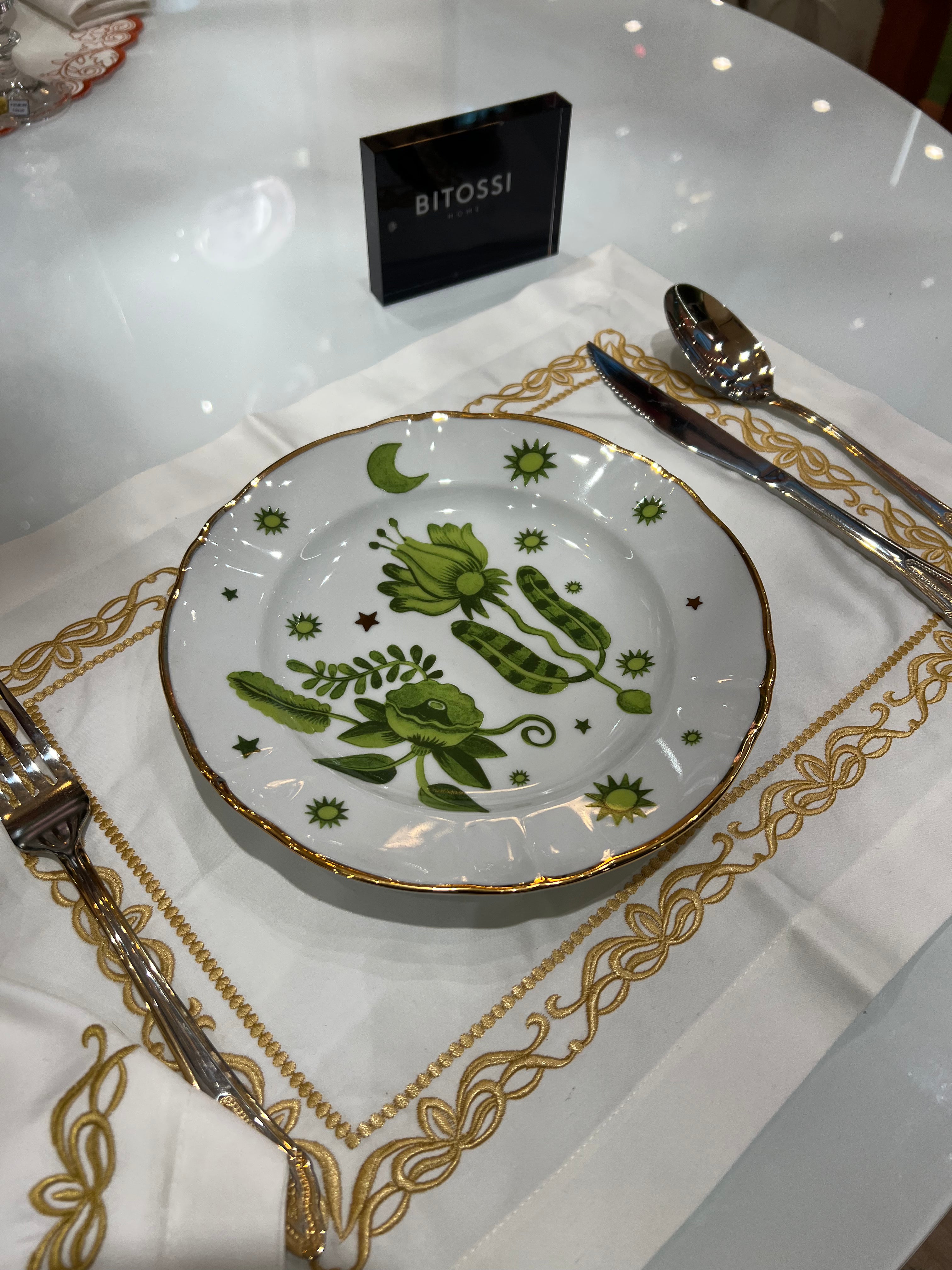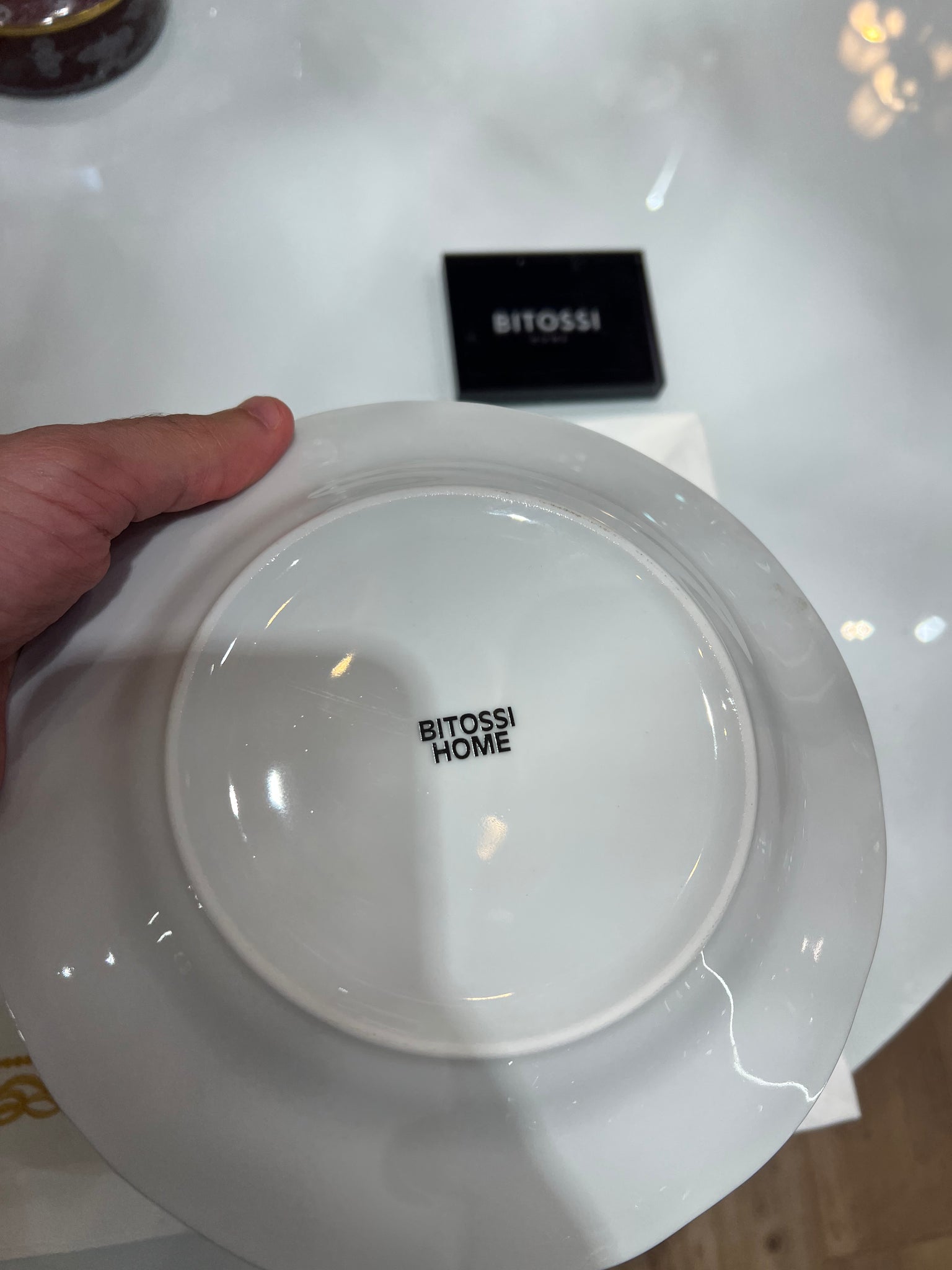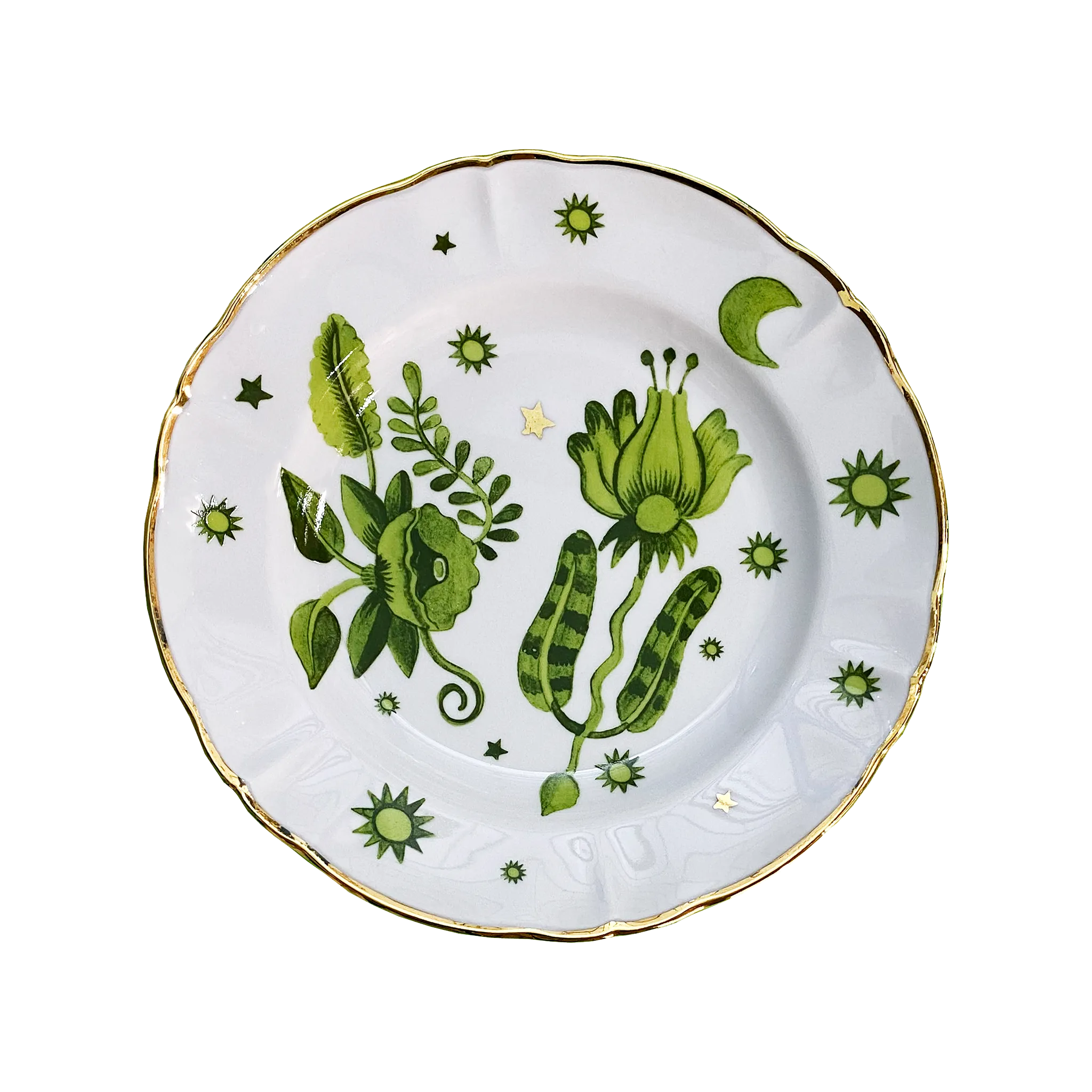 Prato sobremesa unitário, de porcelana italiana Bitossi branca, com decoração floral verde, pintada à mão, e borda com filete de ouro 22k.