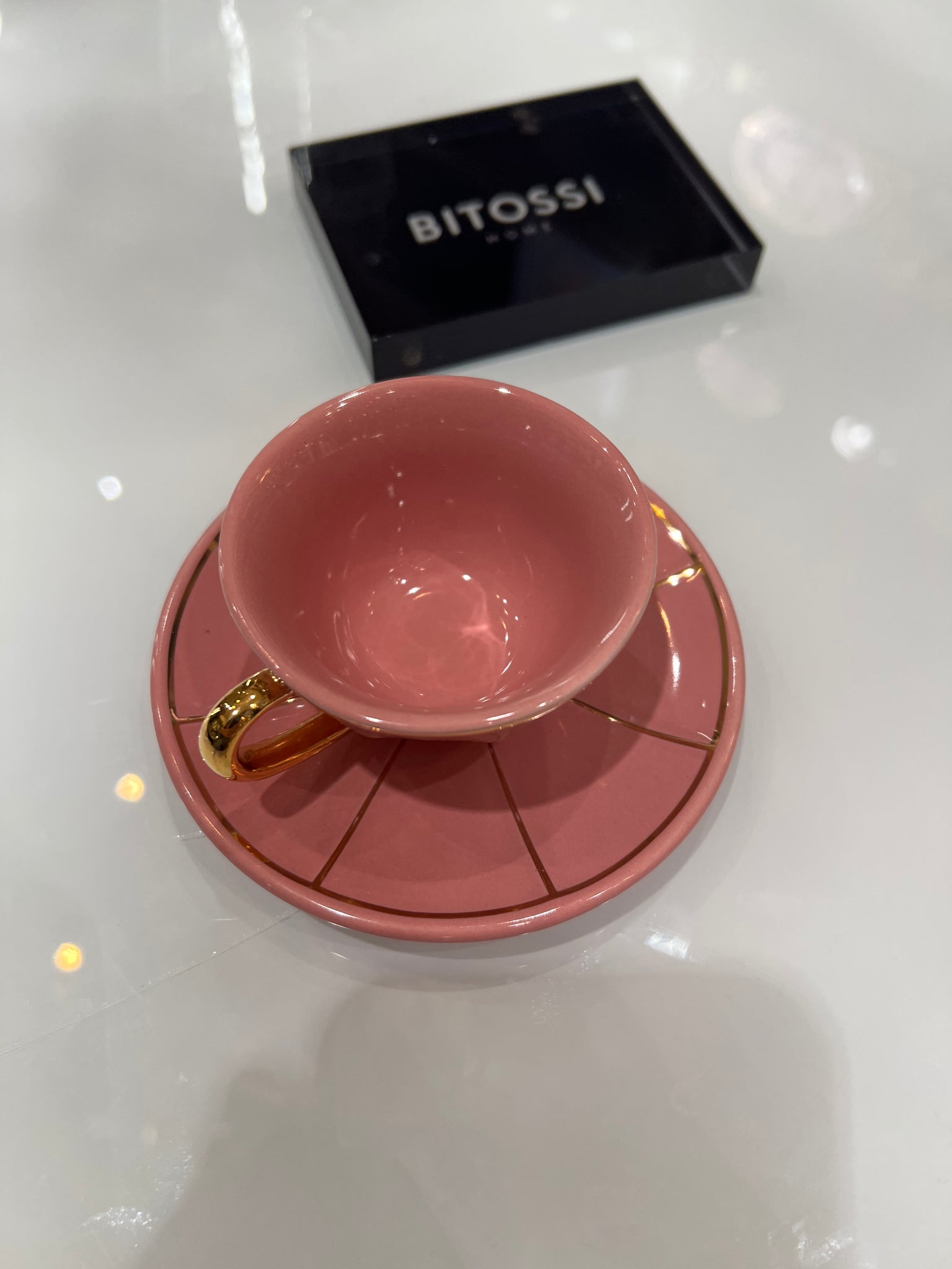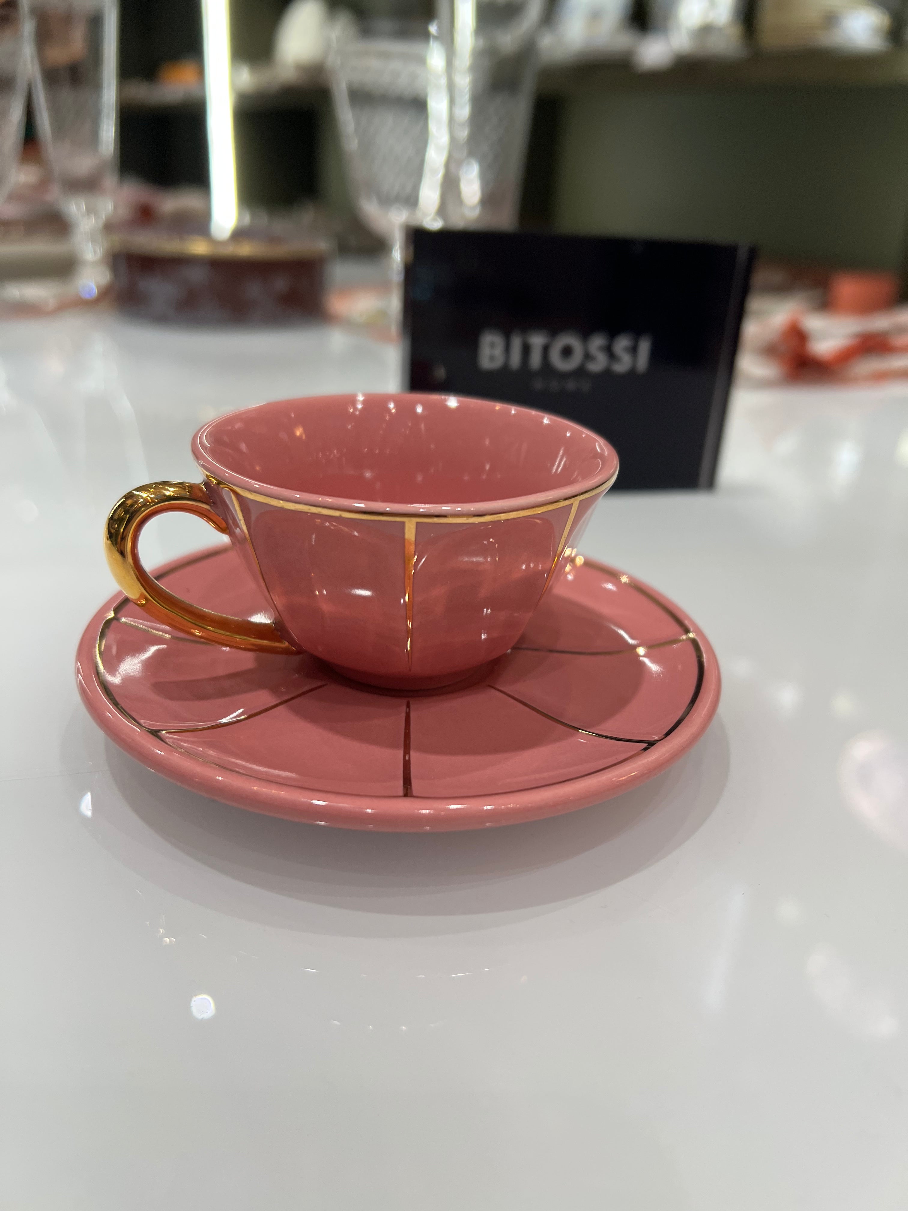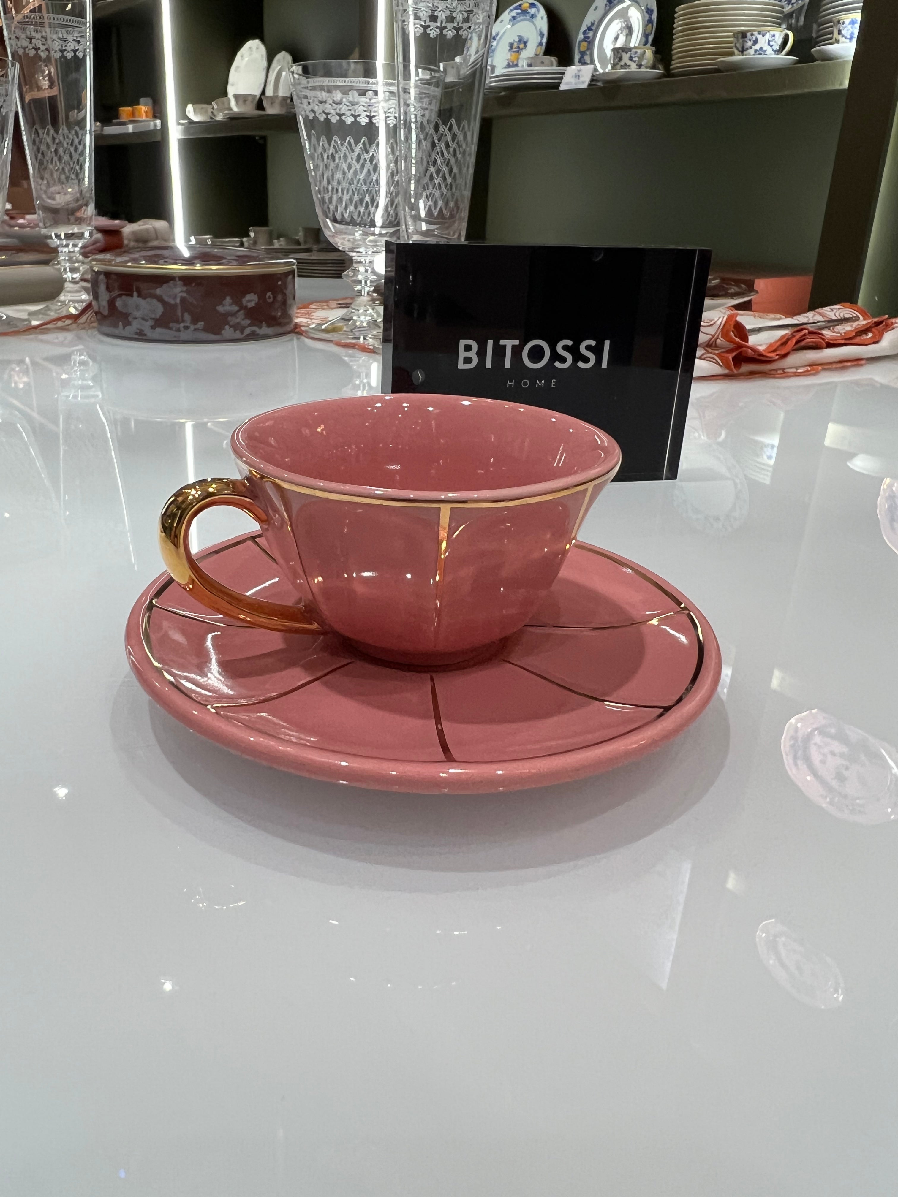 Xicara de café com pires unitária, de porcelana italiana Bitossi rosa, com alça e filetes de ouro 22k.