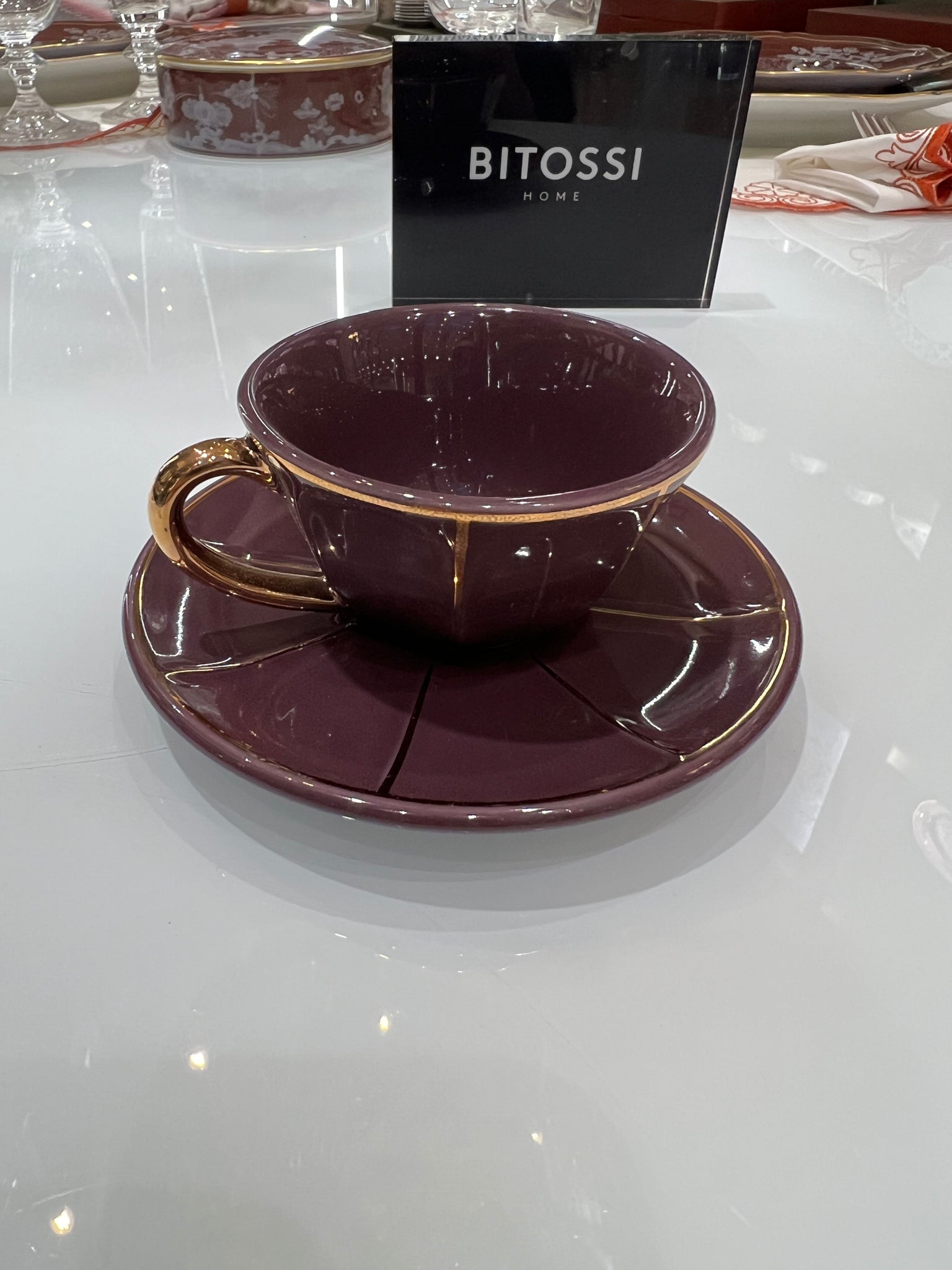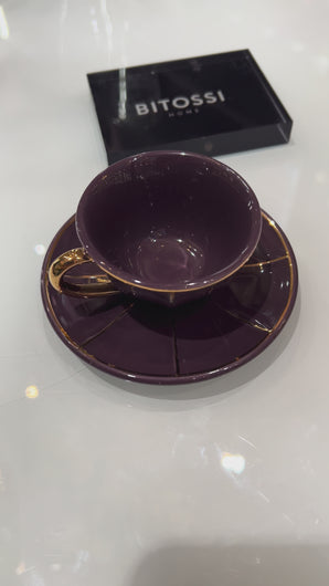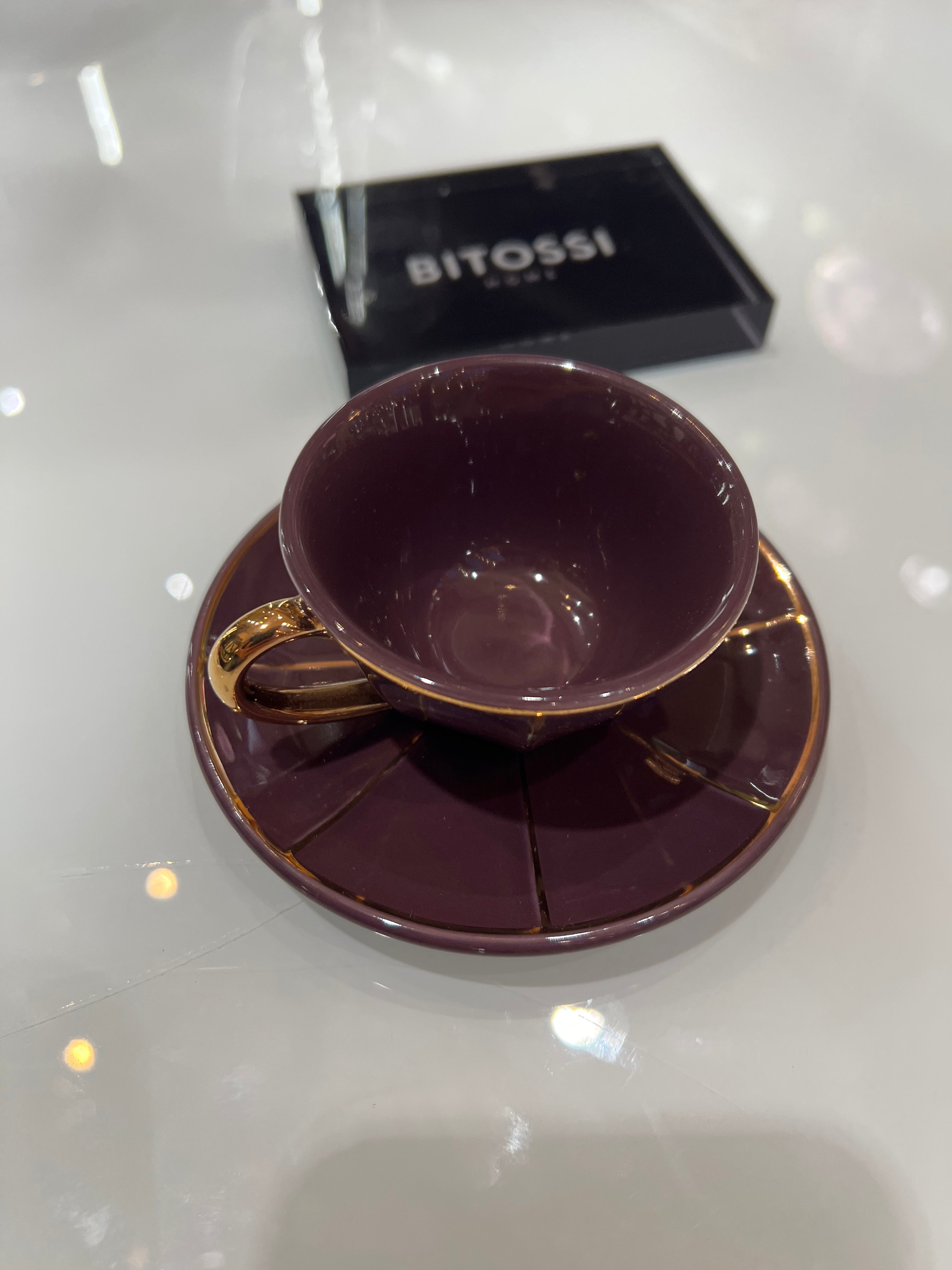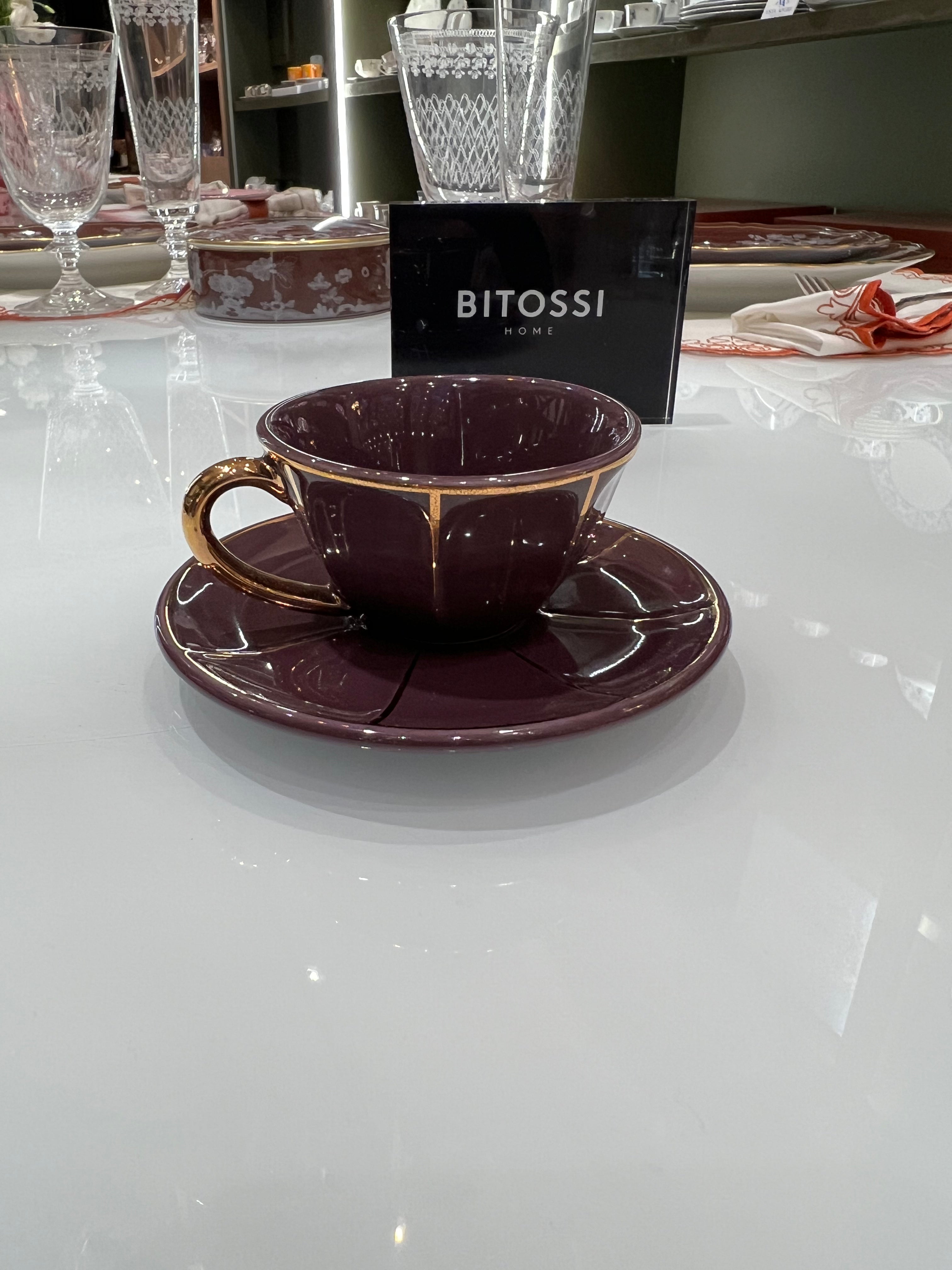 Xicara de café com pires unitária, de porcelana italiana Bitossi roxo , com alça e filetes de ouro 22k.