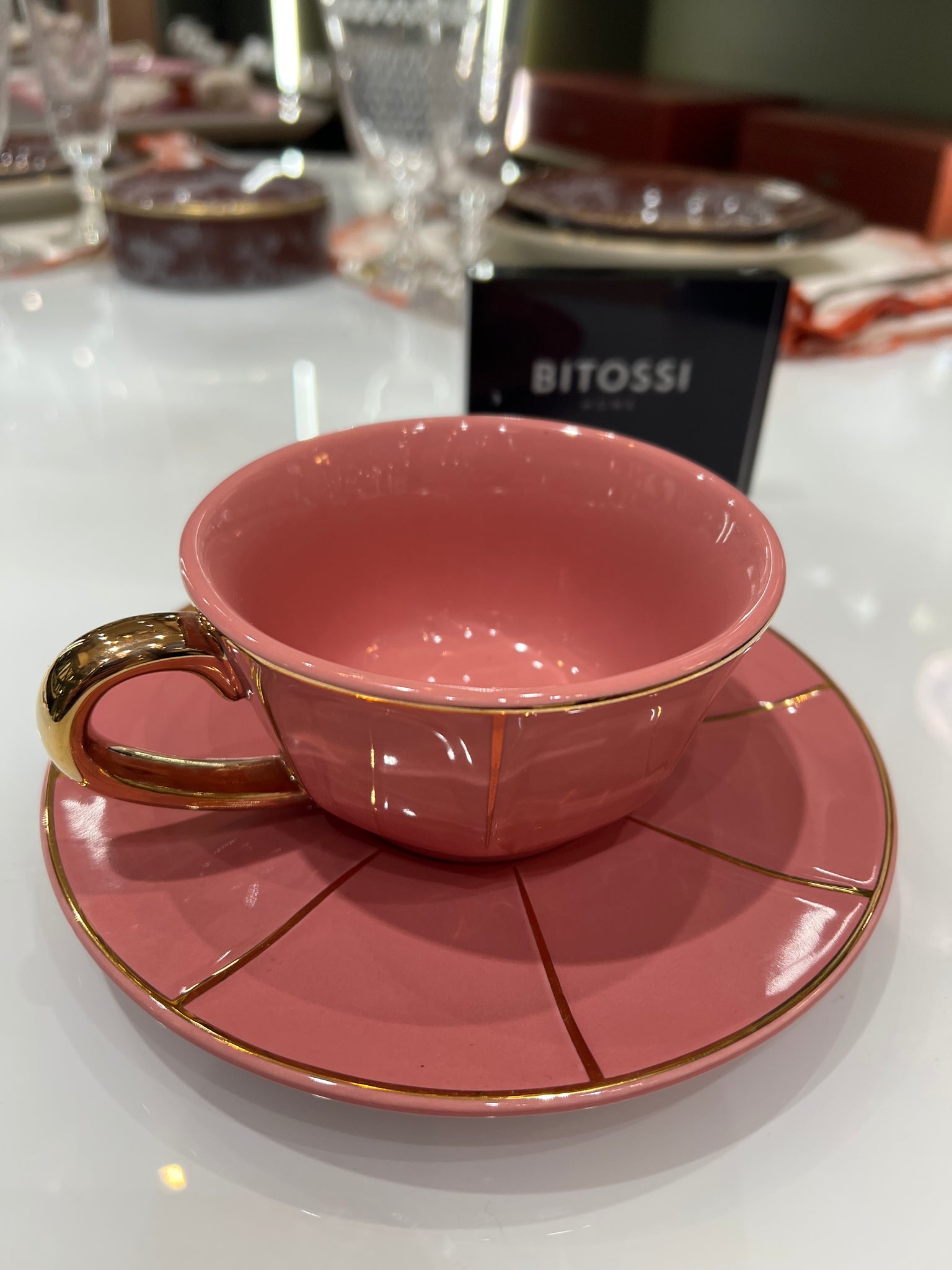 Xicara de chá com pires unitária, de porcelana italiana Bitossi rosa, com alça e filetes de ouro 22k.