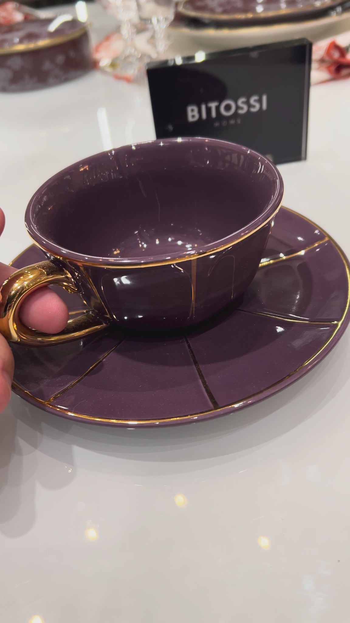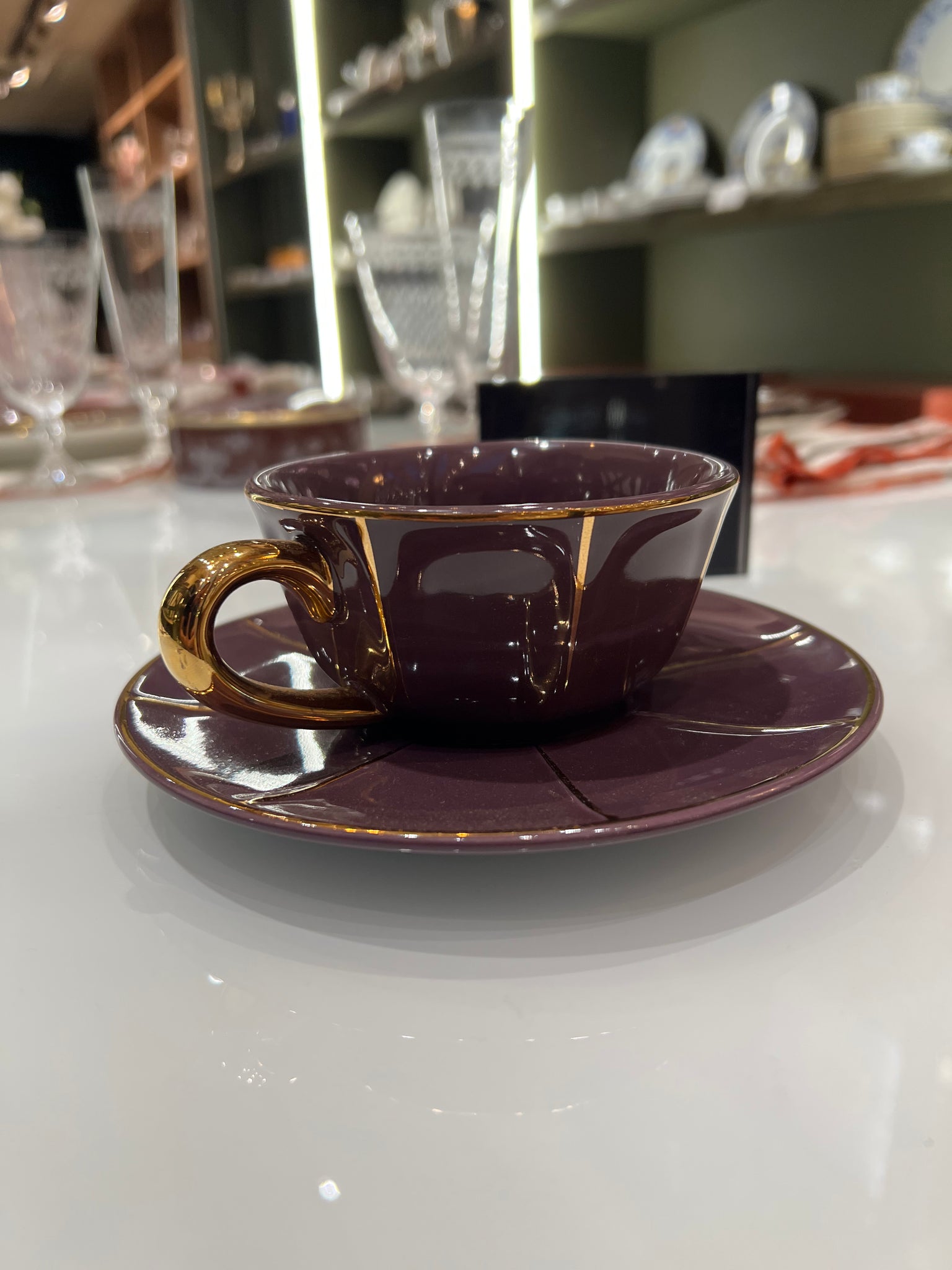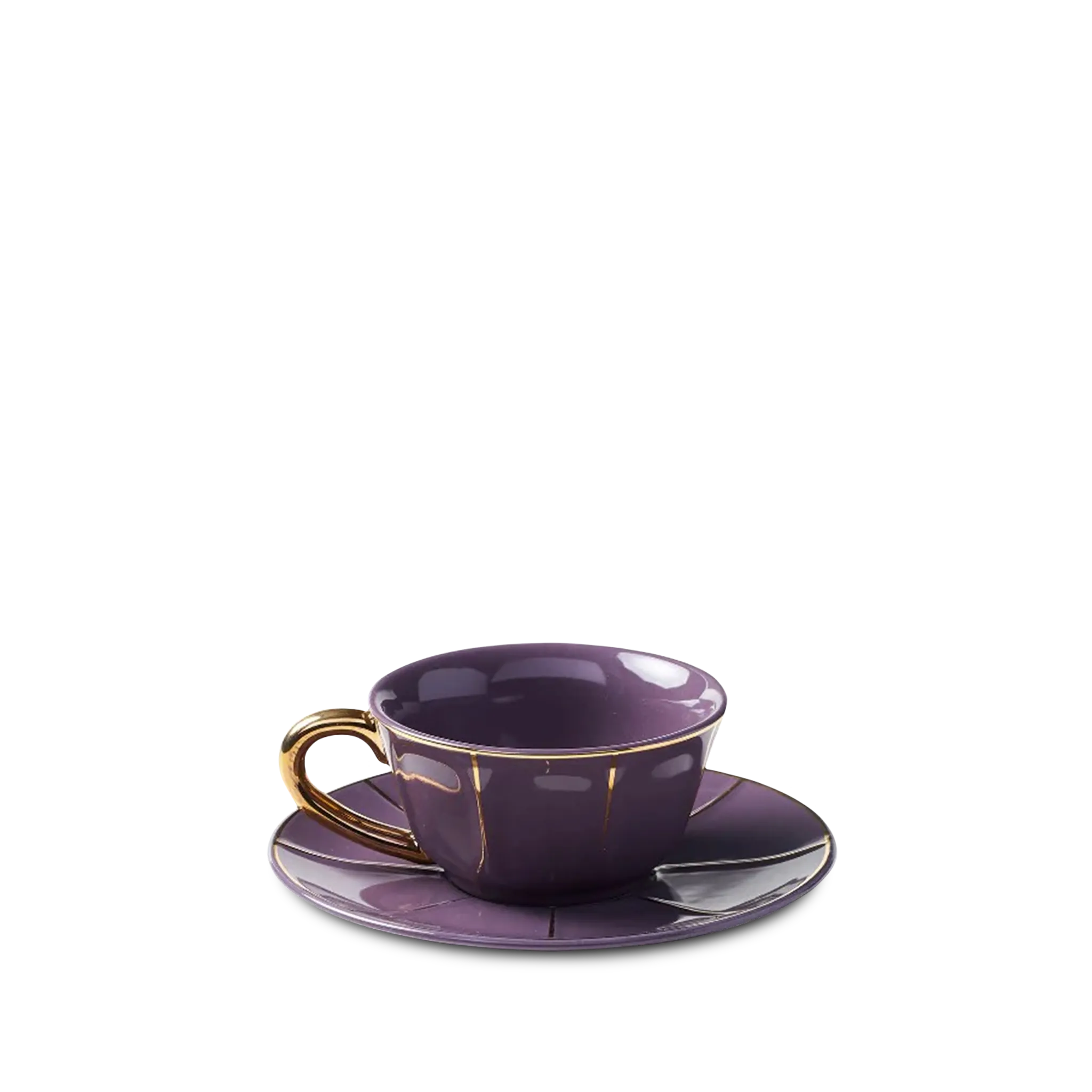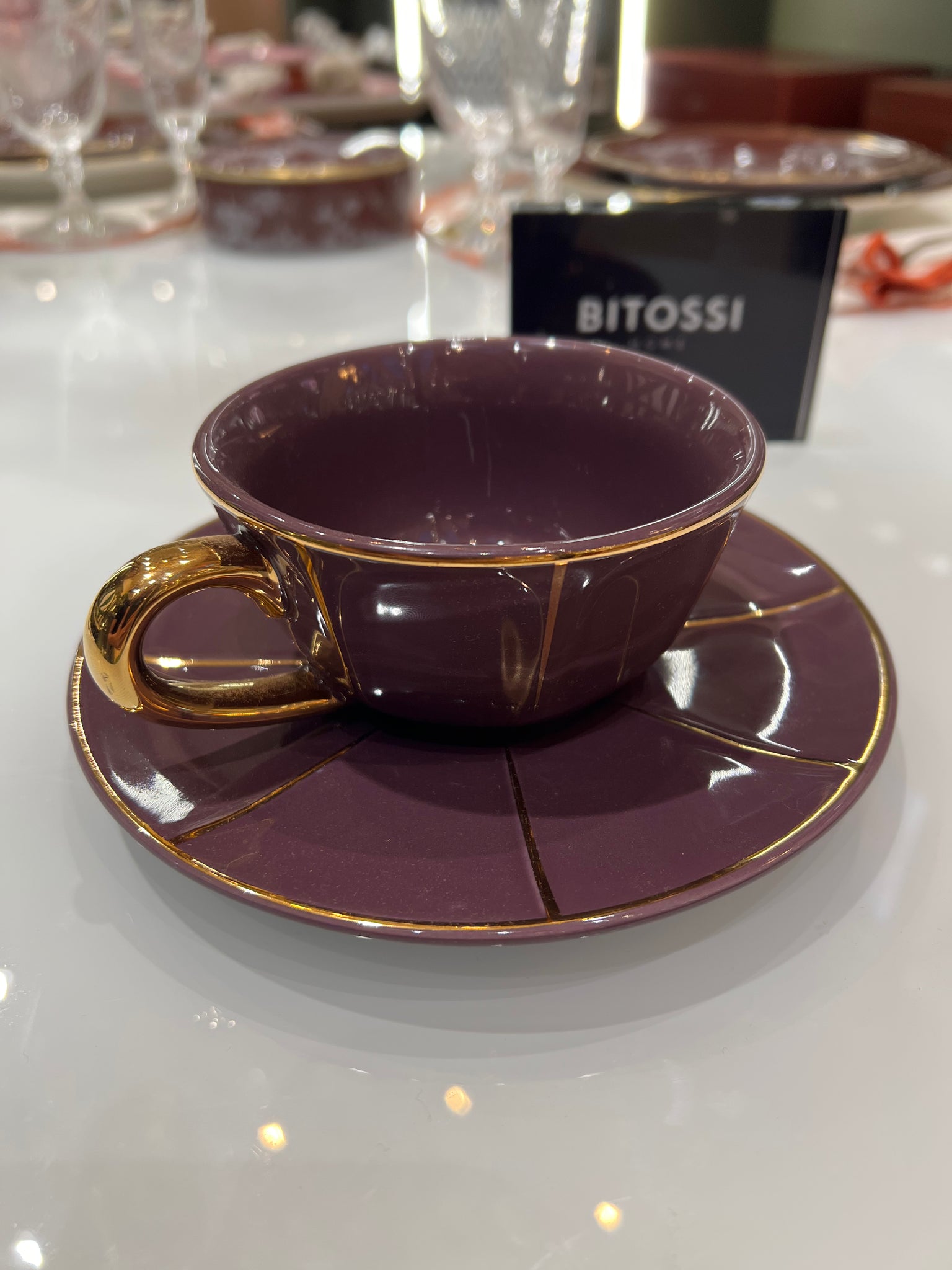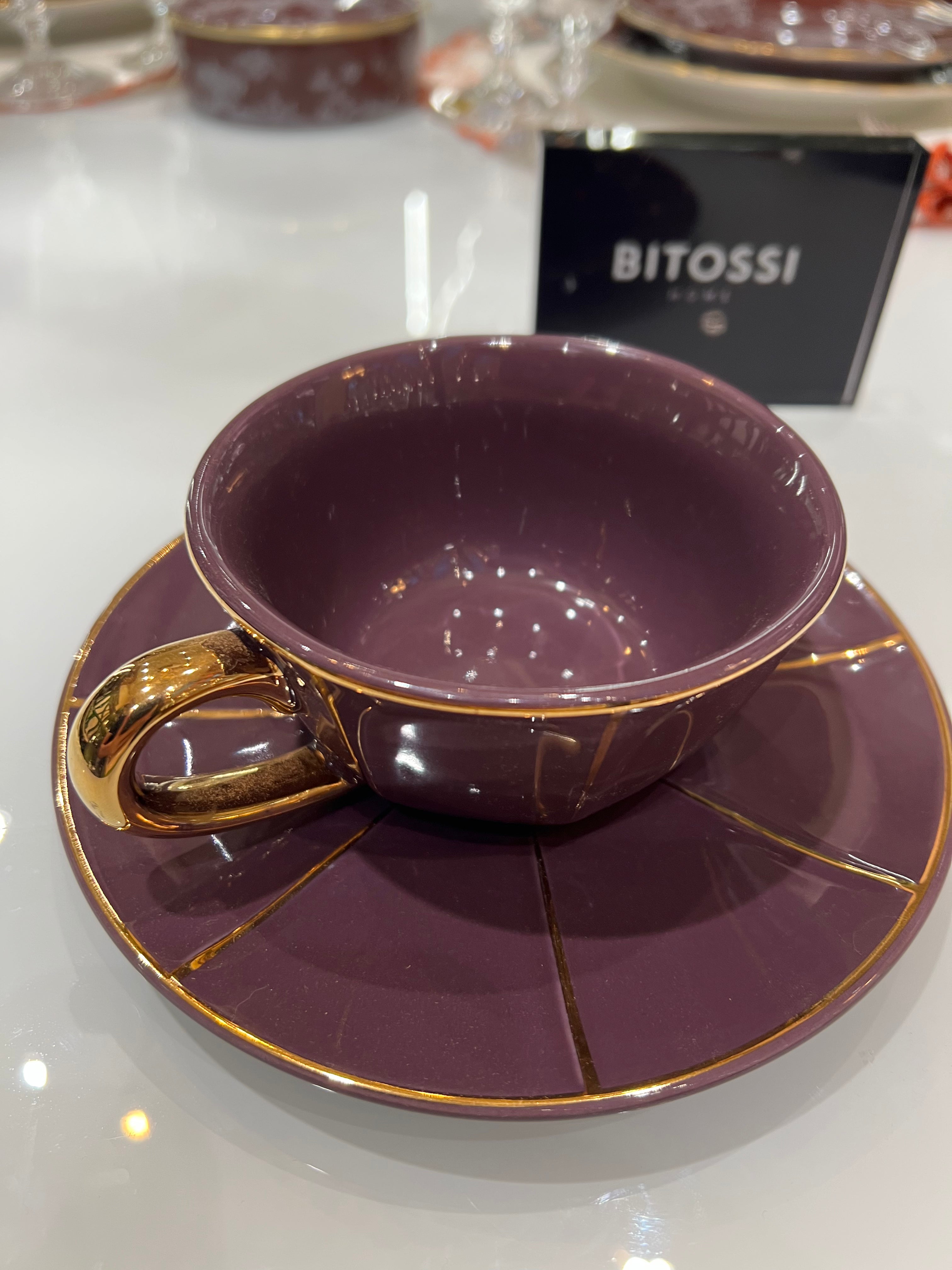 Xicara de chá com pires unitária, de porcelana italiana Bitossi roxo , com alça e filetes de ouro 22k.
